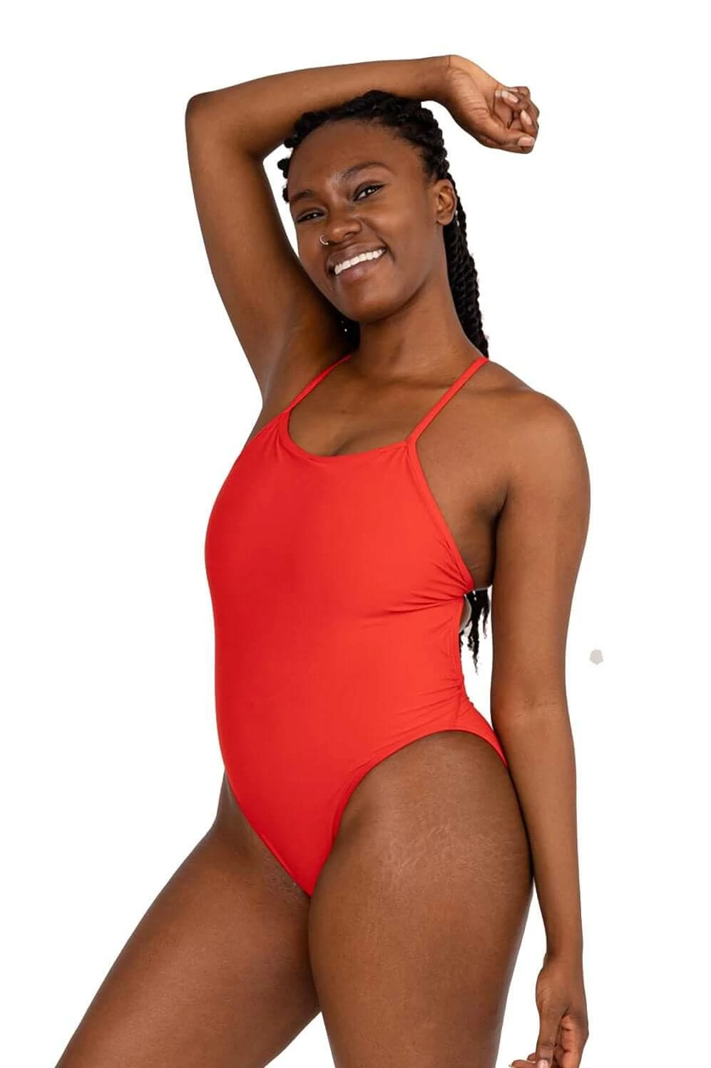 One of our bestselling styles, the Brandon is an adjustable fixed-back, full coverage one piece swimsuit with a criss-cross strap along the back. The strap is designed as one continuous band, which allows flexible distribution of tension along the shoulders and back.Â
