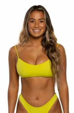 The Hikari is our bestselling Eryn bikini top design but with tie-back straps! This scoop-neck top is perfect for charging waves and the tie straps let you pick your perfect fit. Wear this surfing bikini top in the water or on the beach relaxing – you’ll never have to worry about your top slipping. Made with our stylish yet athletic recycled Sea-flex fabric.