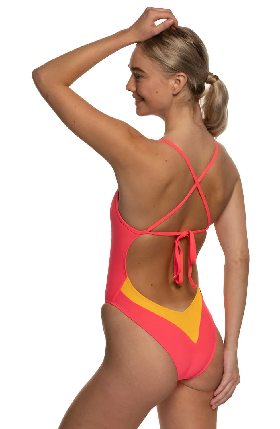 The Jess is a tie-back one-piece swimsuit with a contrast deep V on the back. This swimsuit offers slim bum coverage and adjustable back straps, as well as sturdy fabric that stretches along the length of the body for easy movin’ during your workout.Â