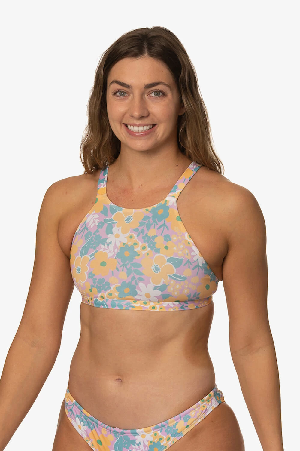 The Kaylee is a high neck, full coverage bikini top with thick straps in the back for the best support. This bikini top can double as a sports bra – rock the Kaylee at a hot yoga class or at swim practice – whatever suits your style!