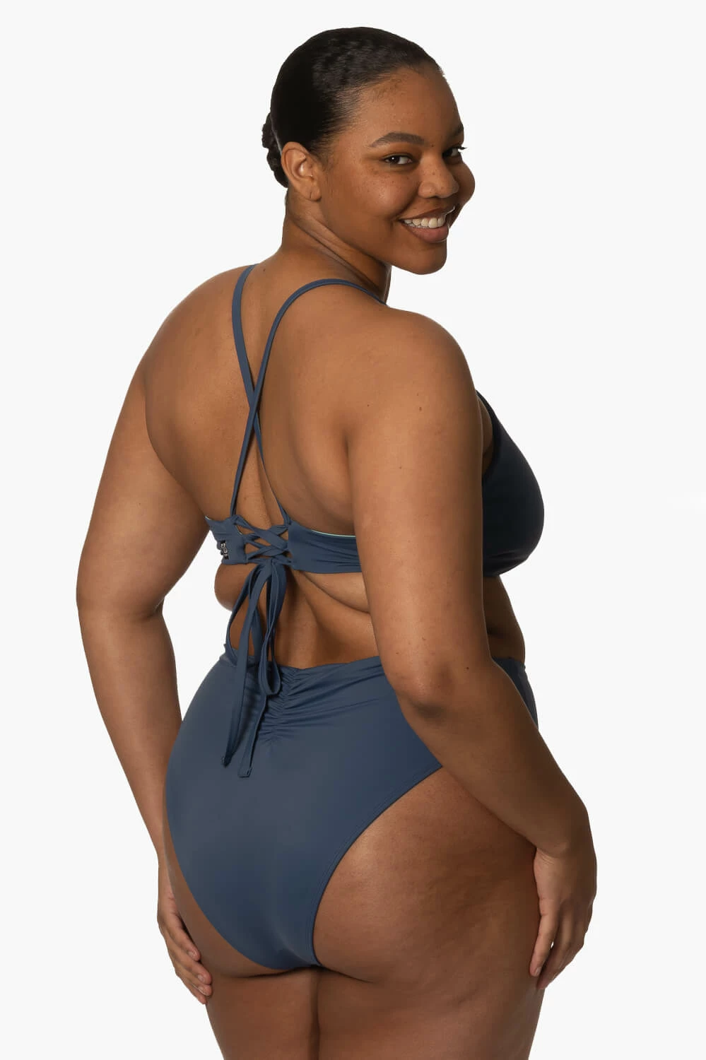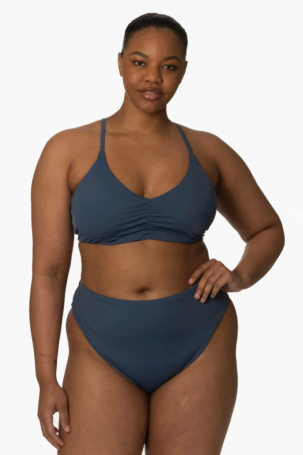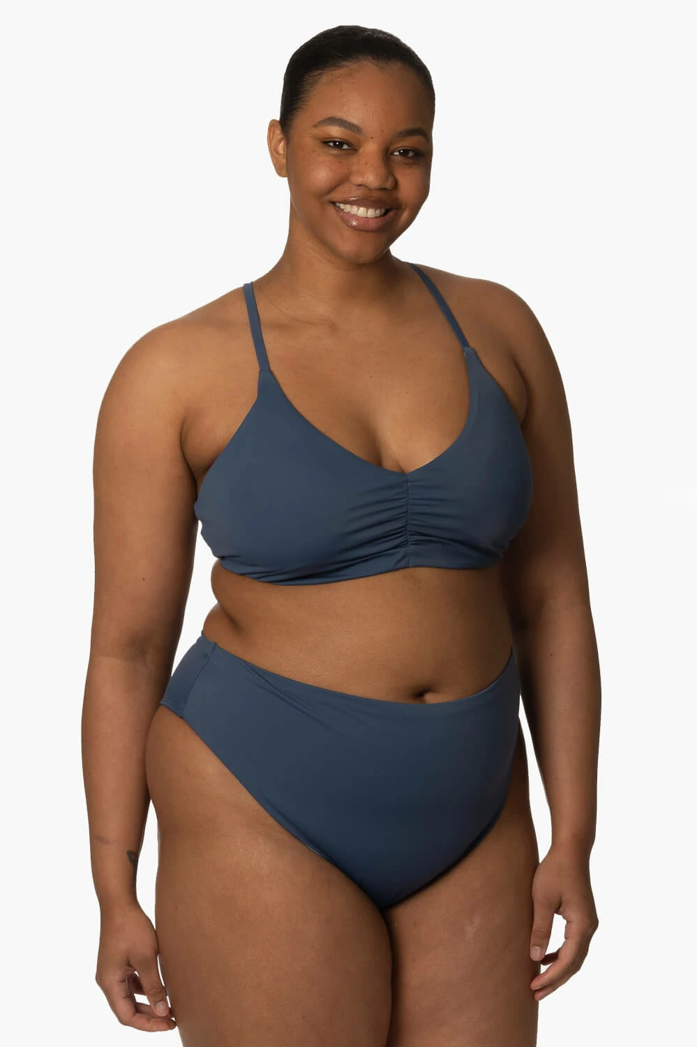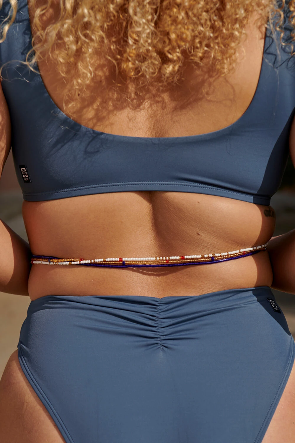 Perfect for all beach activities, the Leandra is the ultimate high-waisted surfing bikini bottom. Specifically constructed with a clean finish around the legs and detailed ruching for comfort. These bikini bottoms will stay put no matter the conditions. Made with our stylish yet athletic recycled Sea-flex fabric.