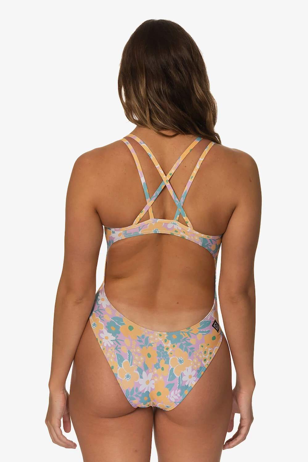 The Murray is a non-adjustable one piece swimsuit with four criss-cross back straps and a slim band around the ribcage. This suit features a filled-in side panel for a secure and flattering silhouette.¬â€