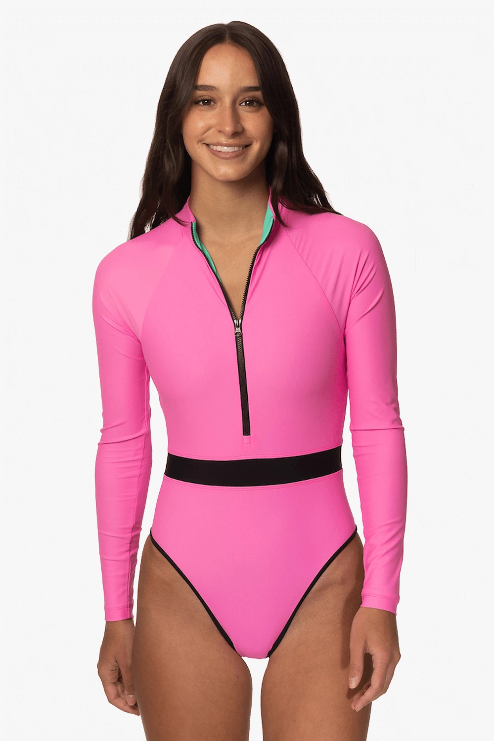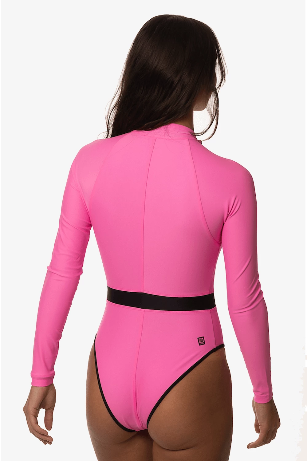 The Nazare women’s long sleeve surf swimsuit is made for playing in the saltwater all day long. The performance-driven design is made with a stylish semi-exposed zipper to prevent rubbing and a raglan sleeve for ease of motion while paddling. With a stylish french cut style, this surf suit is the perfect amount of cheekiness mixed with function. Charge the surf or go paddling, this suit can keep up with any challenge. Thoughtfully designed with our stylish yet athletic Recycled Sea-Flex fabric.