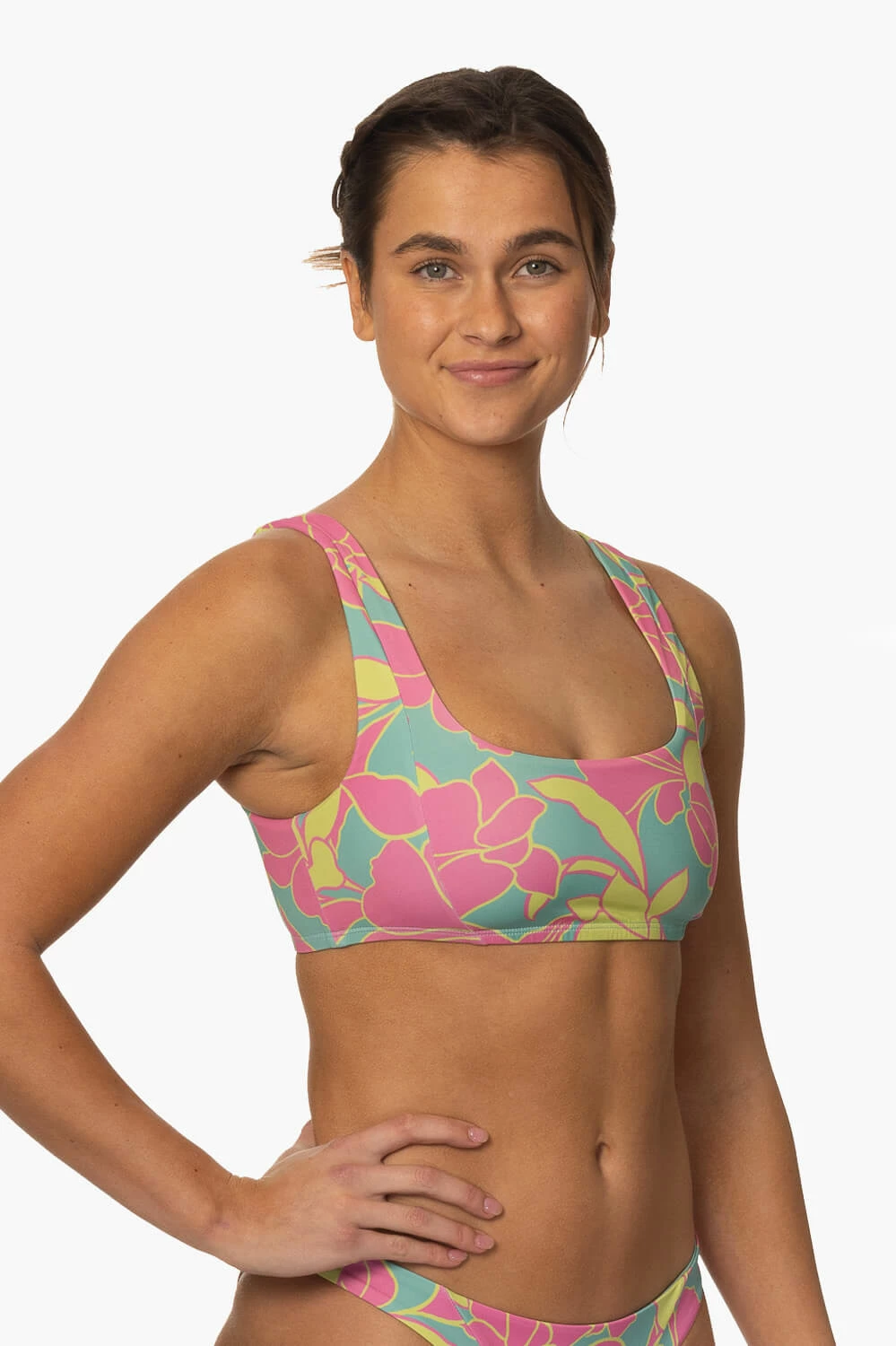 The Paige women’s bikini top is the classic scoop-neck bikini top with a little flair. Surf and stay stylish with contrasting pannels and scooped neck and back, this top will stay on no matter what the conditions are. Wear this surfing bikini top in the water or double it as a bra, thanks to clean finishes, and made with our stylish yet athletic recycled Sea-flex fabric. Get active and stay stylish during all the sunny beach days and big waves ahead.