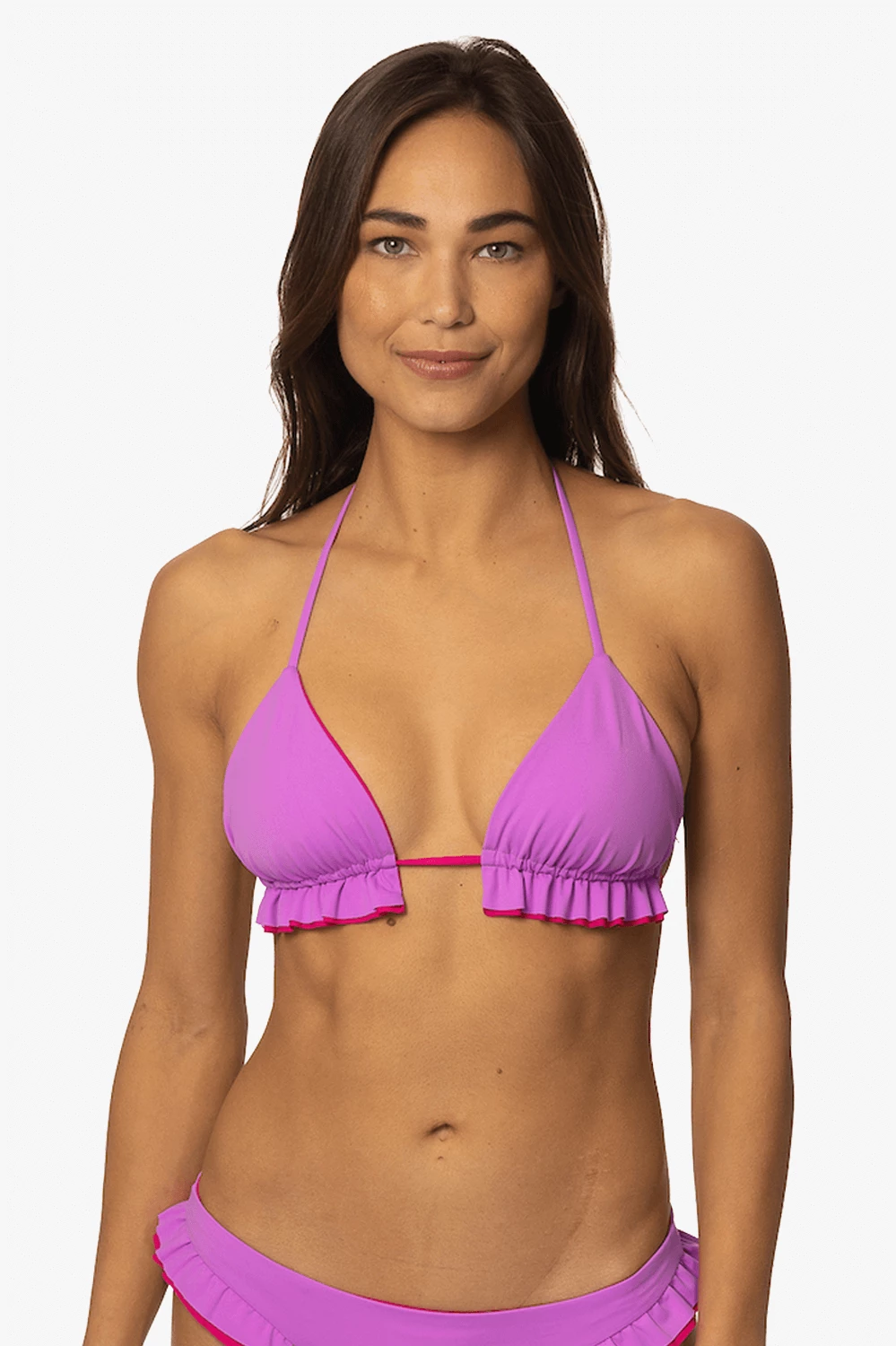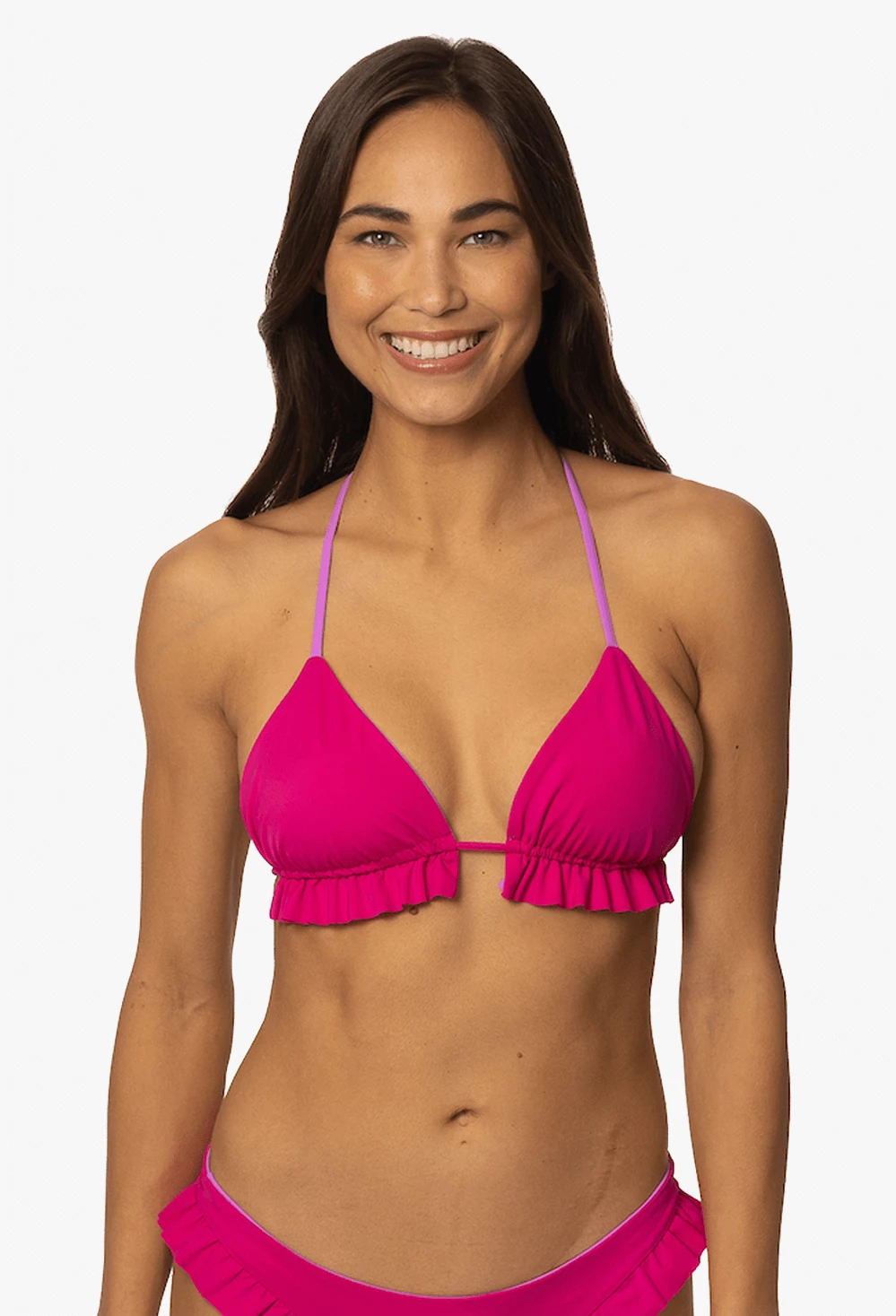 Turn heads in the Pavones women’s bikini top. A twist on the classic triangle bikini top. The Pavones top provides style and functionality for those who want a little flair. With reversible and contrasting colors you can have 2 bikini tops in one! You’ll find any excuse to wear this bikini top. Made with our stylish yet athletic Recycled Sea-Flex fabric.