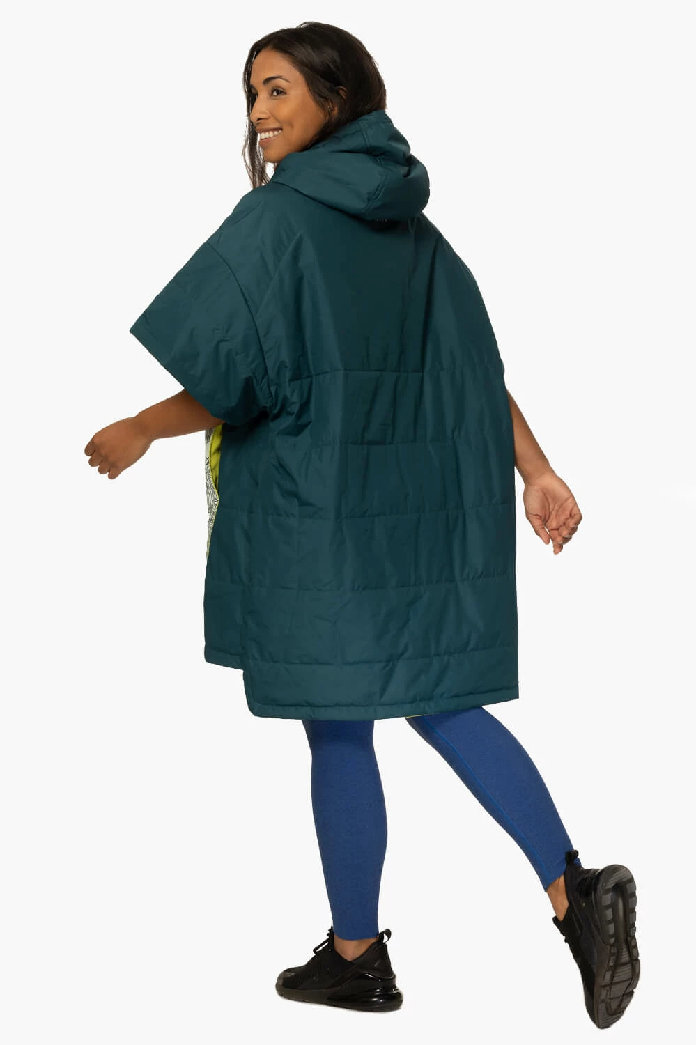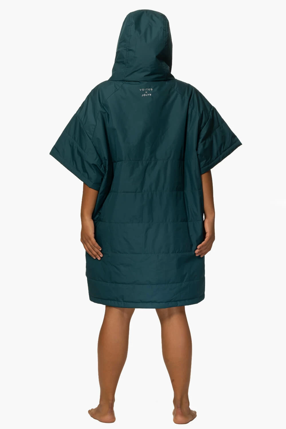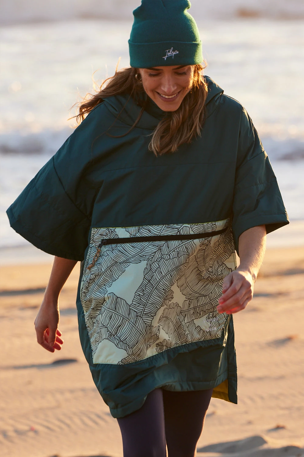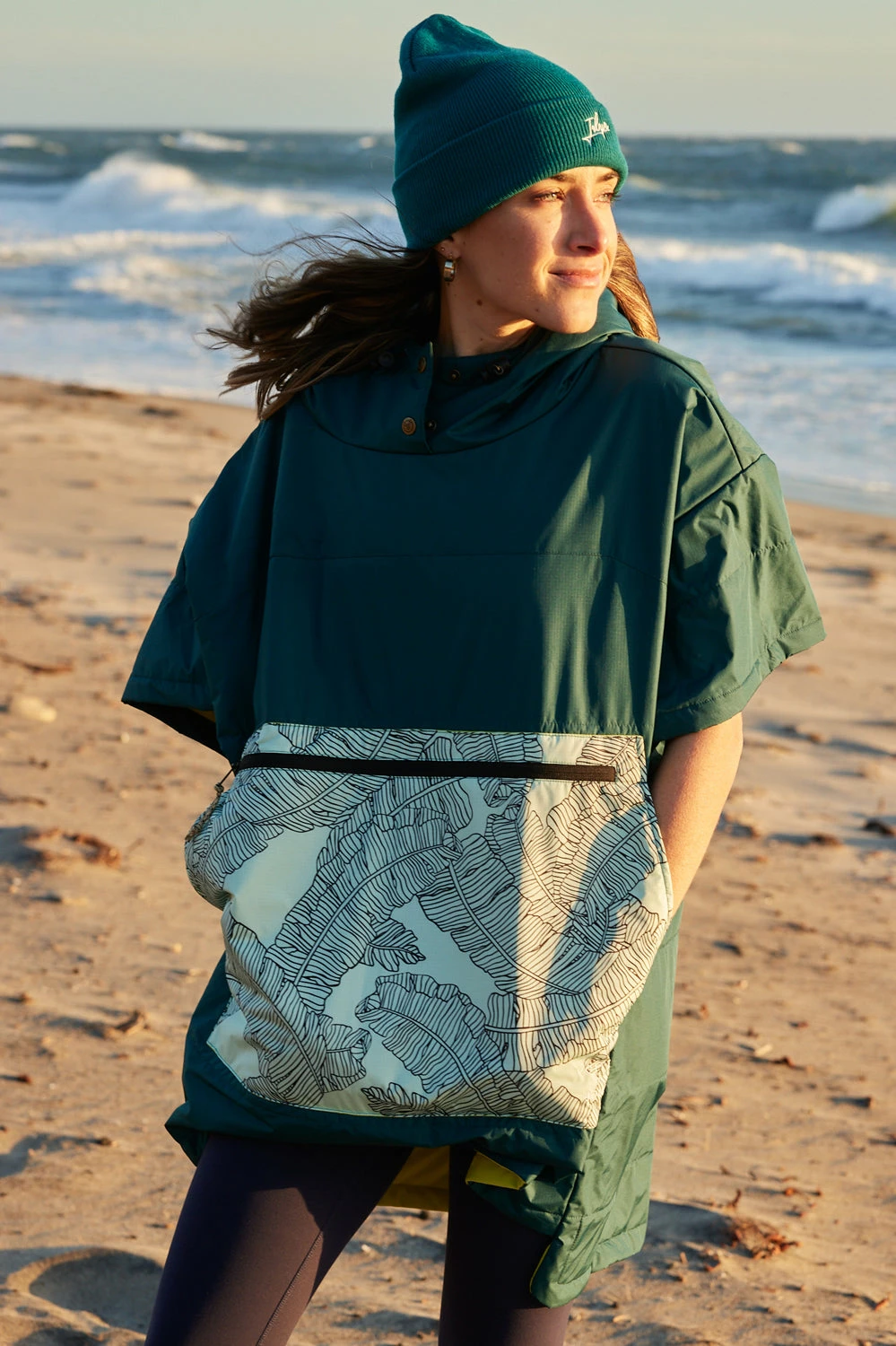 This JOLYN x VOITED surf inspired poncho will keep you warm during dawn patrol and after a sunset surf sesh. Made with 100% recycled 50D Repreve® Ripstop fabric, a waterproof exterior and a soft towel-like interior. The poncho also packs small into its pouch for easy storage or for use as a pillow. The best part – these ponchos are made from recyled plastic bottles. Use it after surfing for a graceful wetsuit change or dry off after swim practice. Drying off and staying warm never looked so good.