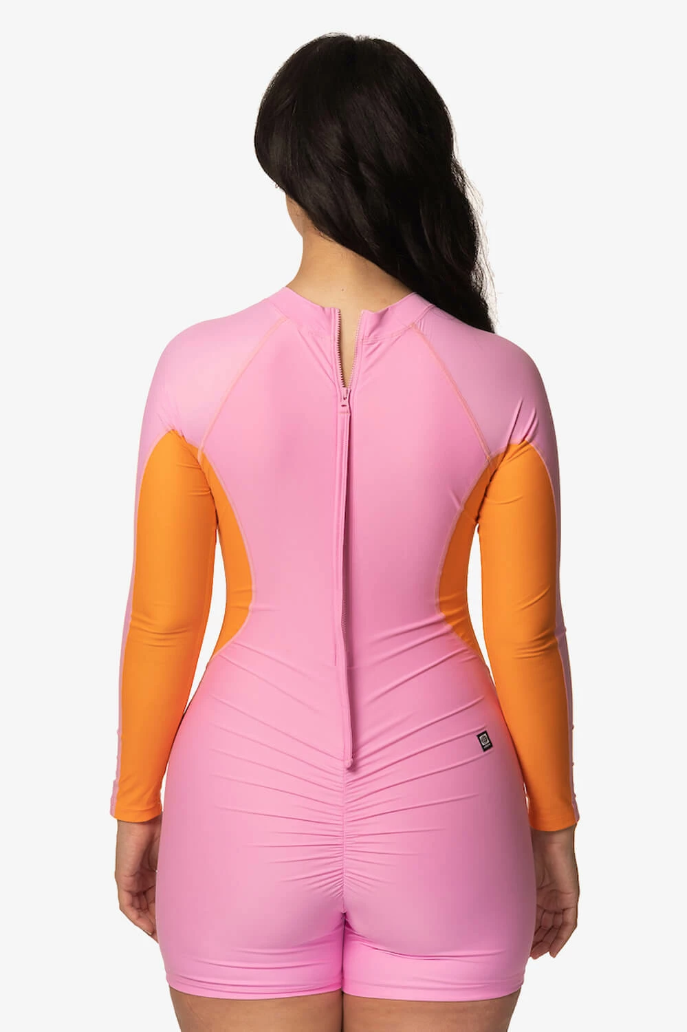 The Zenobia Zip-Up paddle surf suit is great for those long days of paddling at the lineup or long days in the water. Great for all levels of surfer. The long-sleeve top and 5″ inseam legs are free from moving while maintaining support and protecting you from UV Rays. No need to ask for help zipping up, the zipper has a cord attached for self-zipping action. Also, Keep your keys close with a key leash on the inside of the suit and a small pocket to store surf wax for any emergency waxing at the lineup.